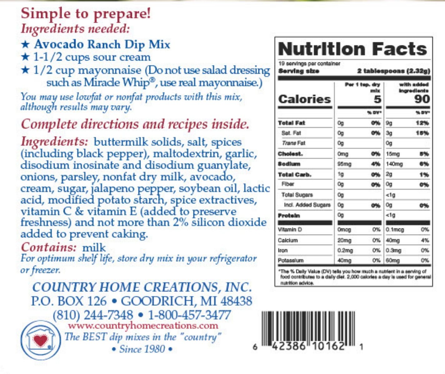 Ranch lovers. . . this is a delicious twist on your soon to be favorite dip mix. A truly unique pairing of savory avocado and a slightly peppery ranch. Perfect served with tortilla chips, fresh vegetables, potato chips or pretzels. Use as a zesty, creamy topping for nachos, tacos or quesadillas.
