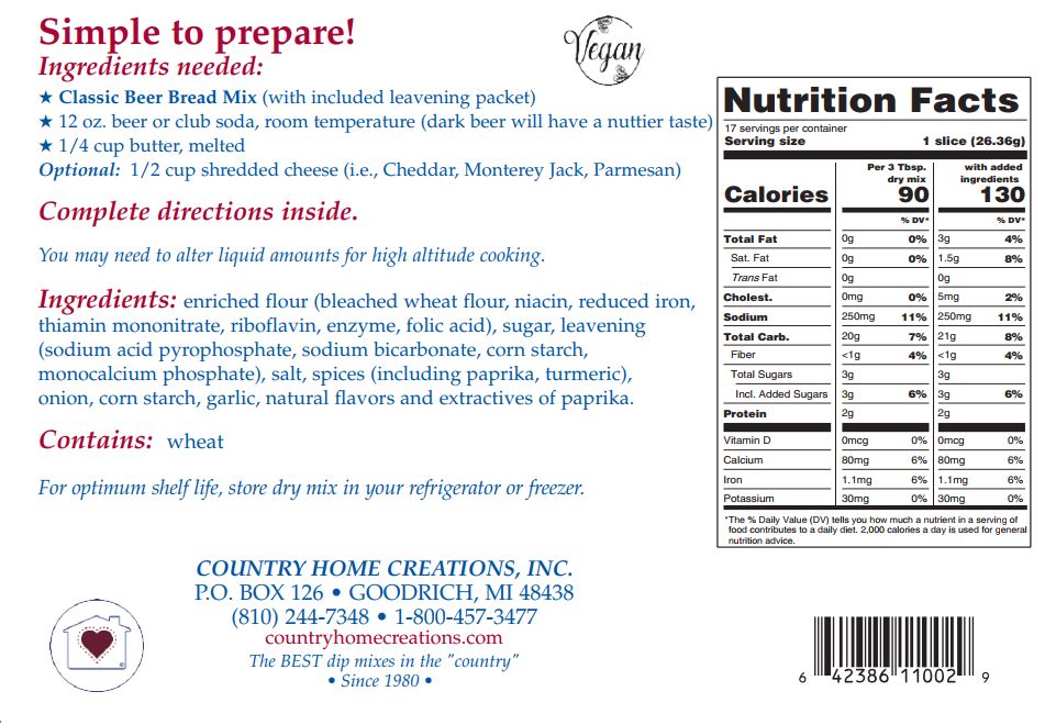 This bread mix is super simple! Just add butter and beer to make a deliciously moist loaf of bread. The old fashioned taste of our beer bread is the perfect complement to our soup mixes!
