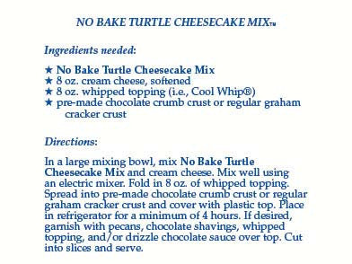 No-Bake Turtle Cheesecake Mix combines pecans, caramel, and chocolate into a rich cheesecake that's so simple to make. It's rich, delicious and will make your mouth water. Just add cream cheese, whipped topping, and place the mixture into a graham cracker pie crust. Also great with a chocolate crust.