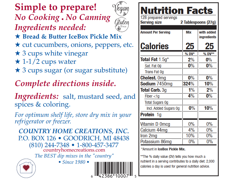 NO COOKING, NO CANNING! If you like to make pickles, but don’t like cooking and canning, then this is the mix for you. One packet of this mix will make a gallon of classic bread and butter pickles. Mix does not contain sugar and has sugar substitute ideas.