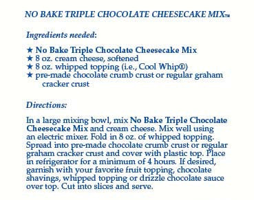 Chocolate, chocolate, and more chocolate! No-Bake Triple Chocolate Cheesecake mix combines our creamy chocolate cheesecake and chocolate chunks for a seriously indulgent dessert. Just add cream cheese, whipped topping, and place the mixture into a graham cracker pie crust. Try a chocolate crust for even more rich chocolate flavor!